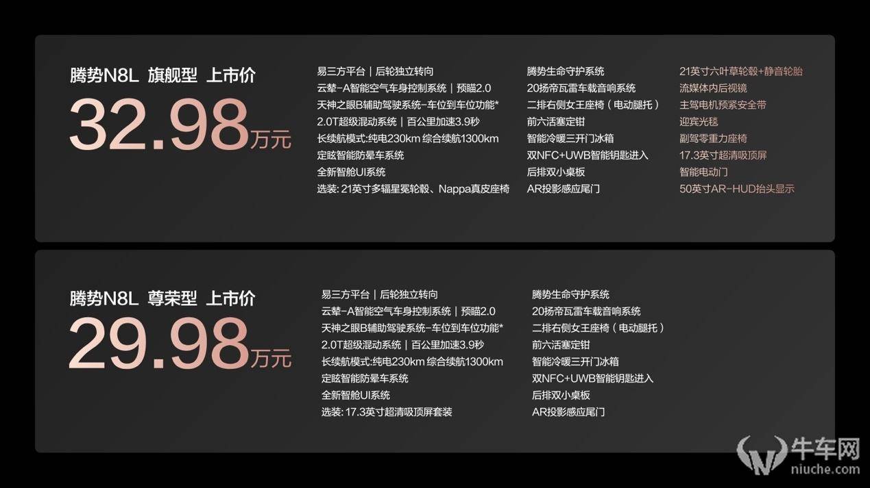 正式上市,共推出2款车型,官方指导价为29.98万元~32.98万元!N8L全系标配“六大核心科技”,以超越传统豪华的品质标准,诠释家用车的豪华感、安全感与科技感,创造让全家人动心、舒心、省心、安心、暖心的出行体验,以“五心体验 三感相伴”定义美好出行,将奢华体验平等赋予每一位家庭成员。