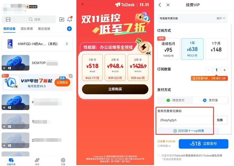 针对游戏玩家群体,ToDesk游戏版本次也带来了专属福利。年包首单特惠218元,较原价298元直降80元;常规年包优惠价258元,两年包从598元优惠至436.4元,三年包从894元降至619.9元。